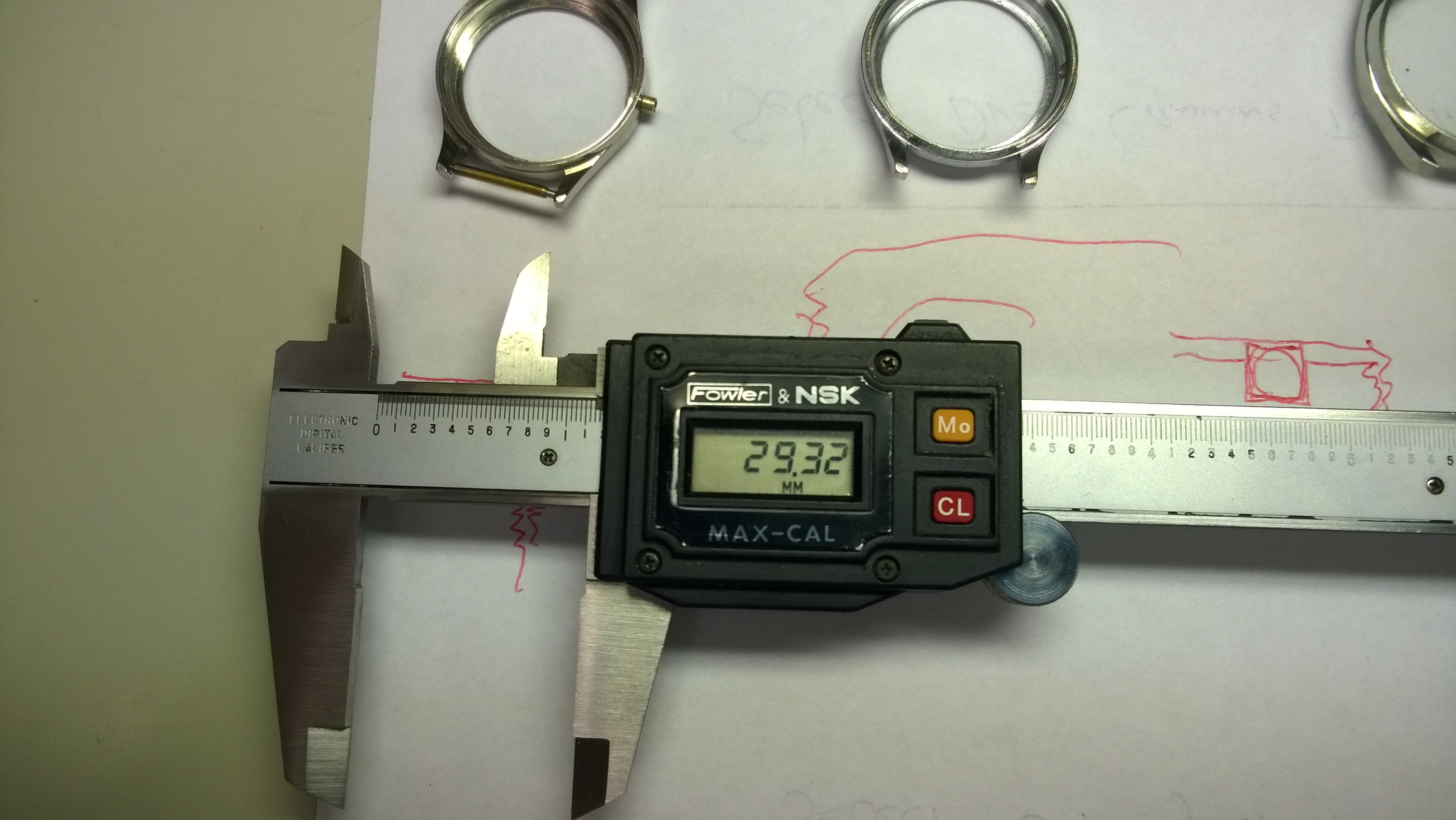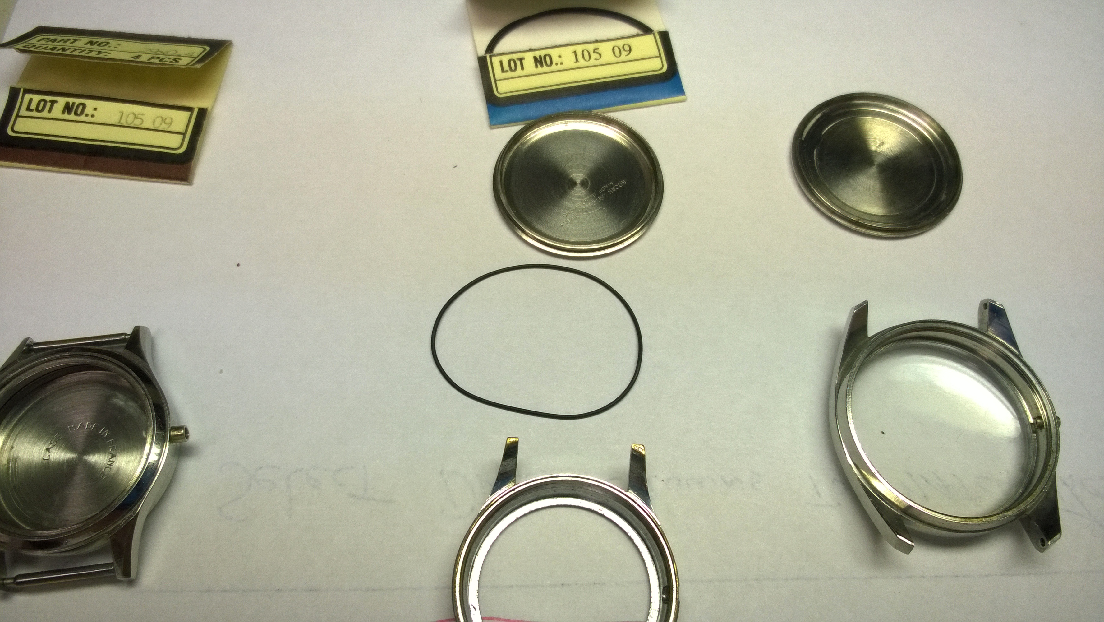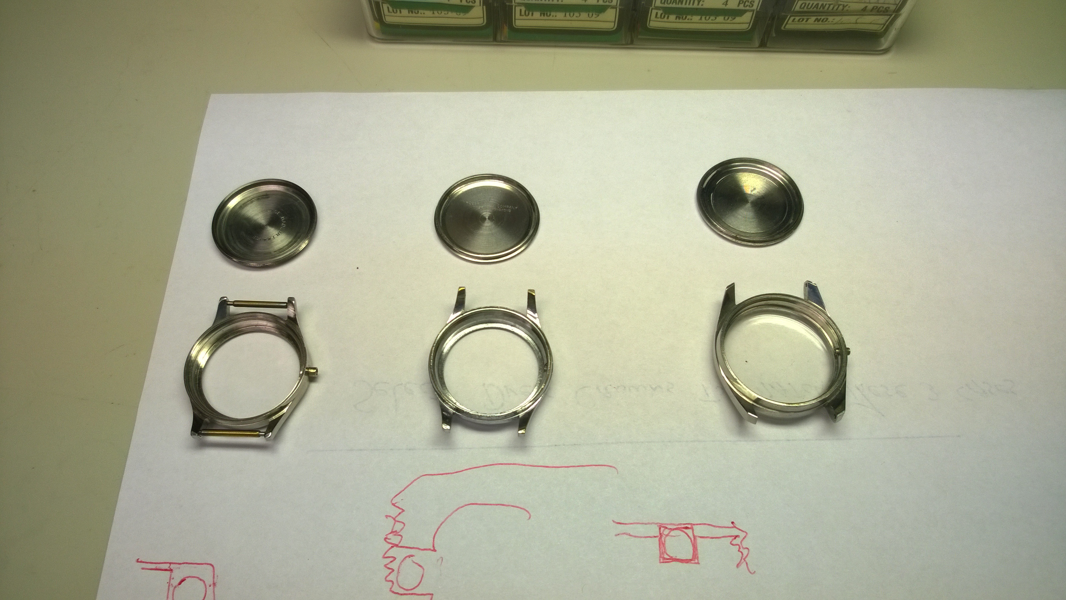 Here are the watch cases I worked with. The red drawings are ones that Mr. Poye did showing different ways gaskets can fit in a watch.