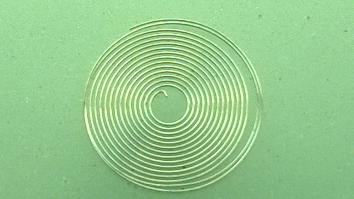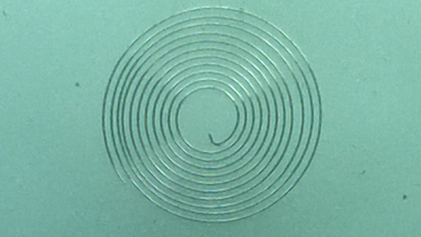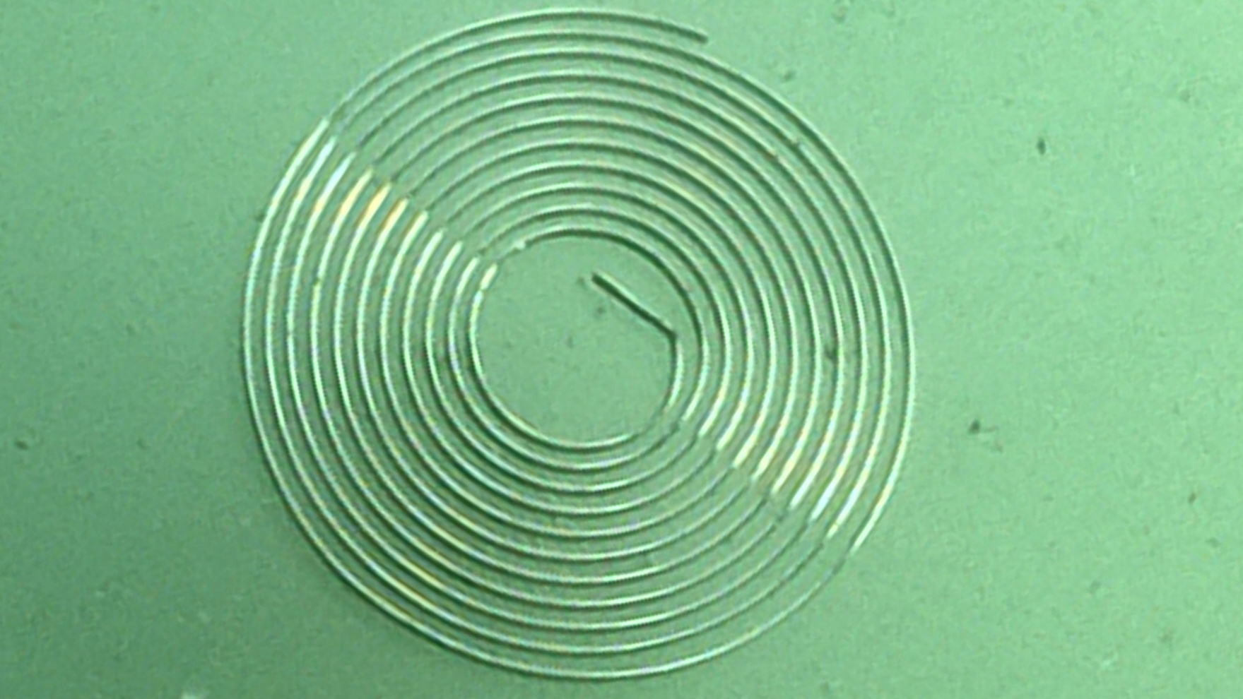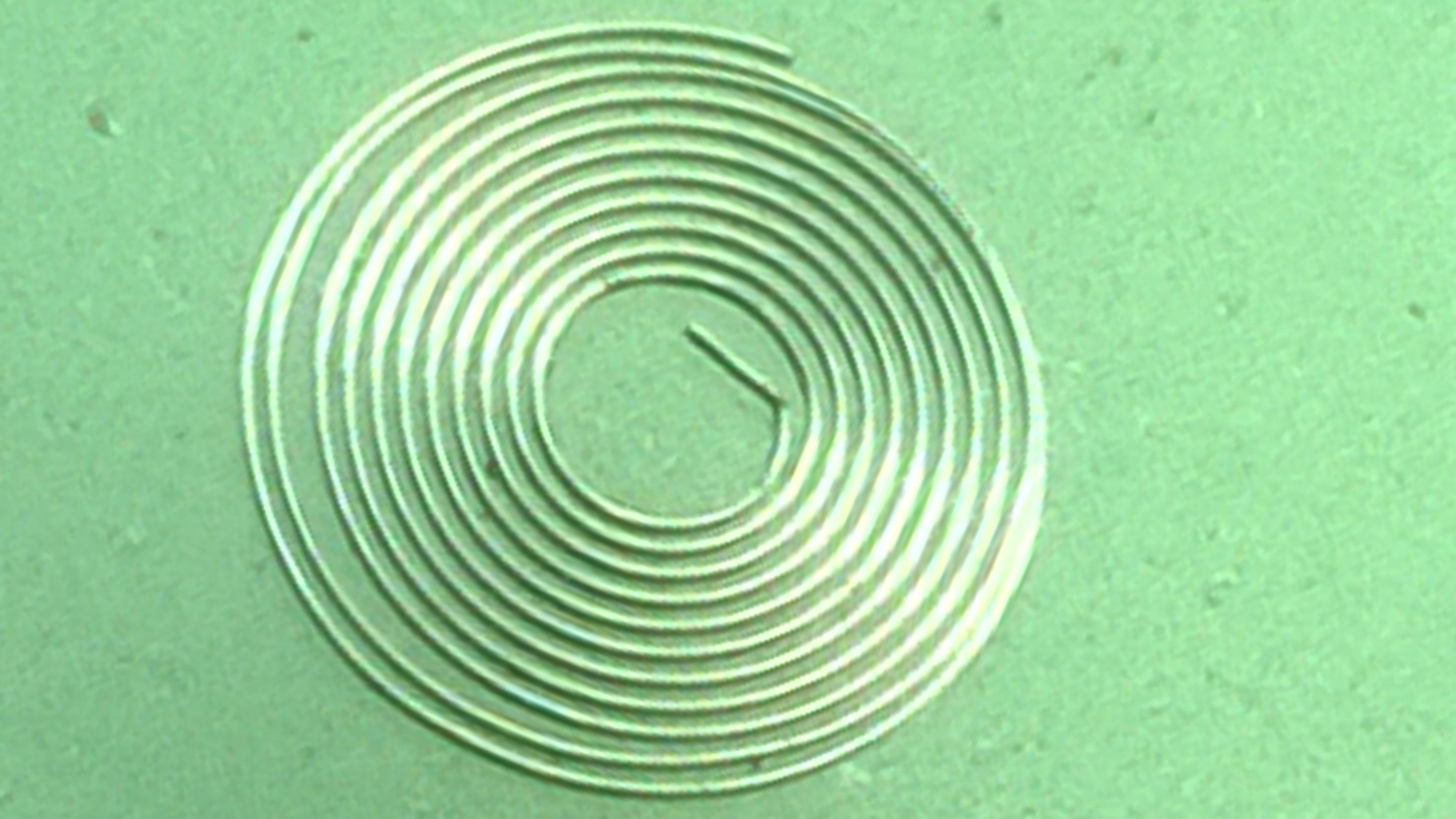 Each time I correct the hairsprings, Mr. Poye re-bends them, but this time, he is making the new bend 1/4 turn more into the hairspring. As you can see, and will see in some other pictures, as the bend gets further into the hairspring, there is a lot more distortion. On the left side, the coils are a lot closer together due to the bend creating the gap on the right. Once the bend is corrected, the spring looks a lot better:
