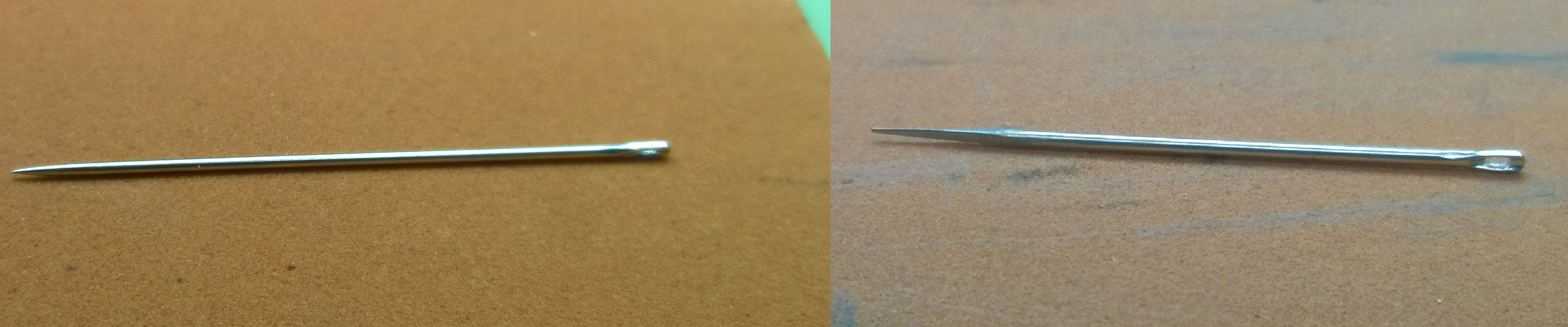 Here is a comparison of the needle before and after I got done creating the wedge profile. Once I got the drill end finished, Mr. Poye sunk it into a piece of pegwood.