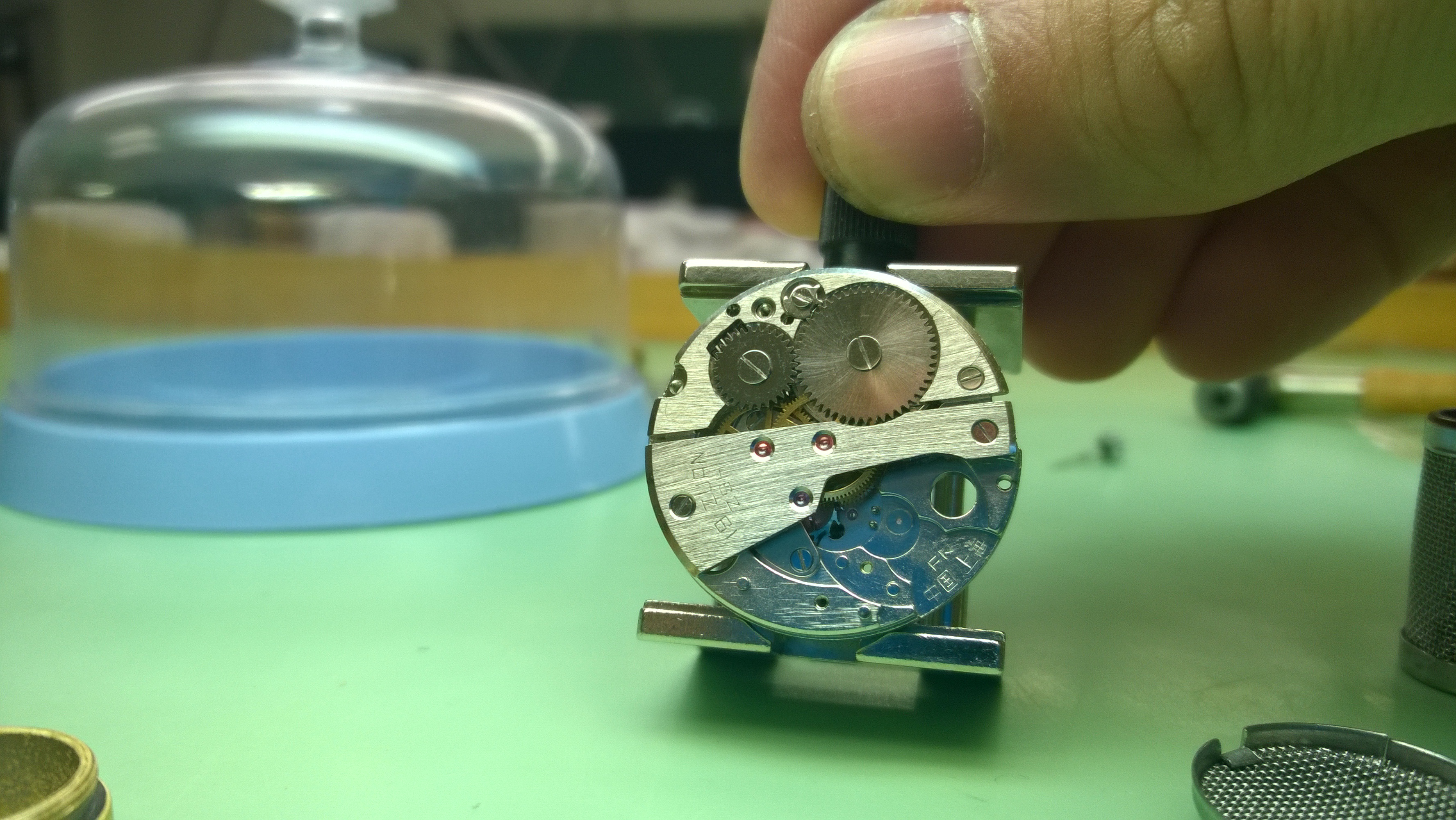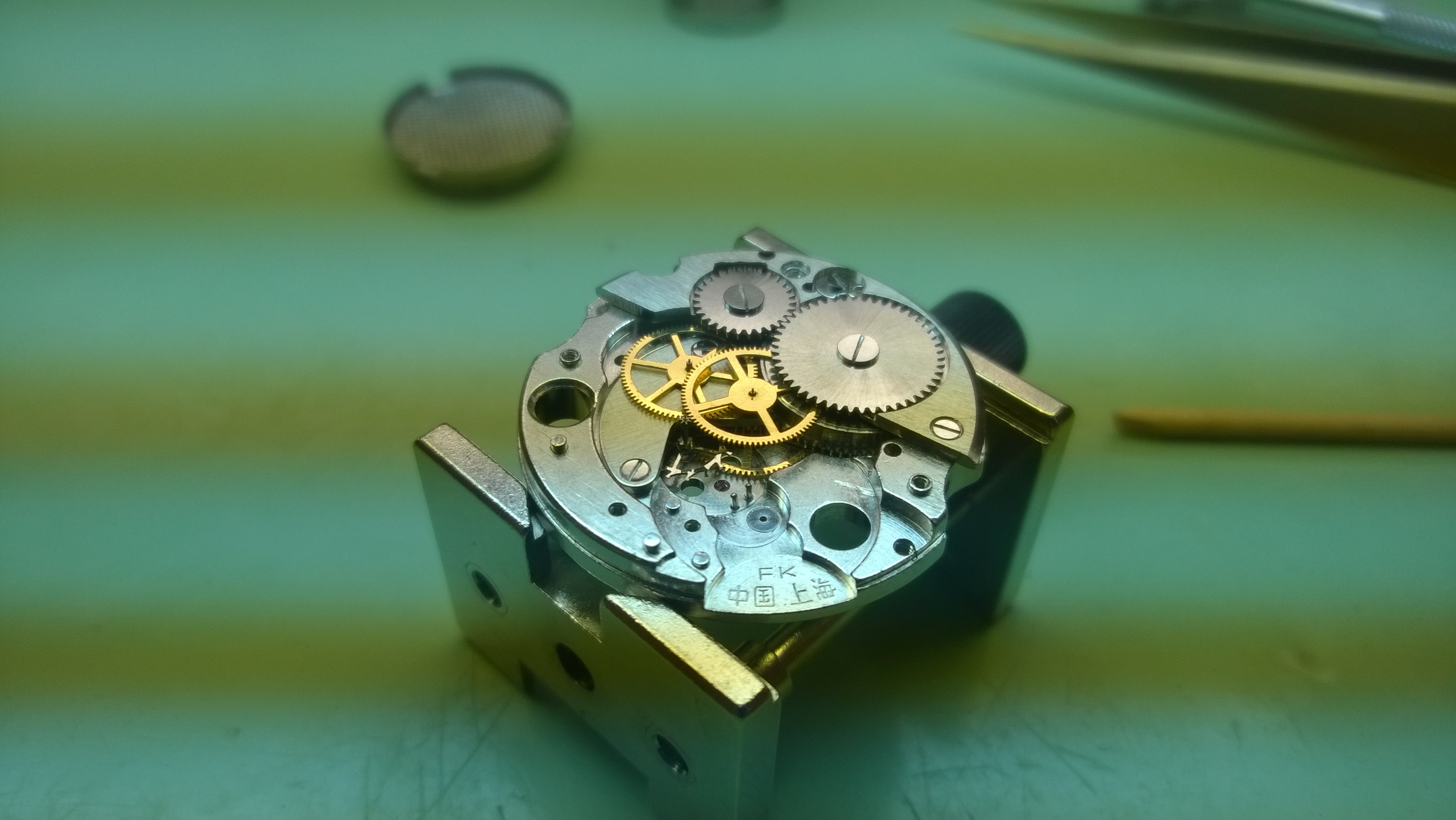 I don’t have much to say about this past Monday. More strip-downs, cleaning/polishing and re-assembly. Mr. Poye did give me an interesting movement to work on-it was a Chinese made one. It was missing its set lever screw, so that made things a little complicated. The set-lever interacts with the winding stem (and crown) and helps engage the winding stem with the clutch. There is a screw that holds it into place, and in turn keeps the stem in place. A lot of watches are designed where you need to remove the stem before you can remove the movement. By loosening the set lever screw, you are able to release the tension that keeps the lever engaged with the stem. When the screw is missing, it poses some difficulty with the assembly, but not enough to make it impossible. The real issue is you aren’t able to go between the winding and setting position with the stem.