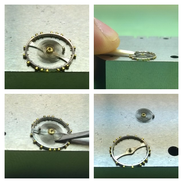 Taking the balance complete, you pick an appropriate size hole on your bench block that will accommodate the roller table of the balance wheel-you don’t want it super-tight or loose (Top left picture). From there, using some peg-wood and the one of the tools that I made last week, you gently work the collet up and off of the wheel (top right, bottom left). Once you are done, you will have the hairspring and balance separated.