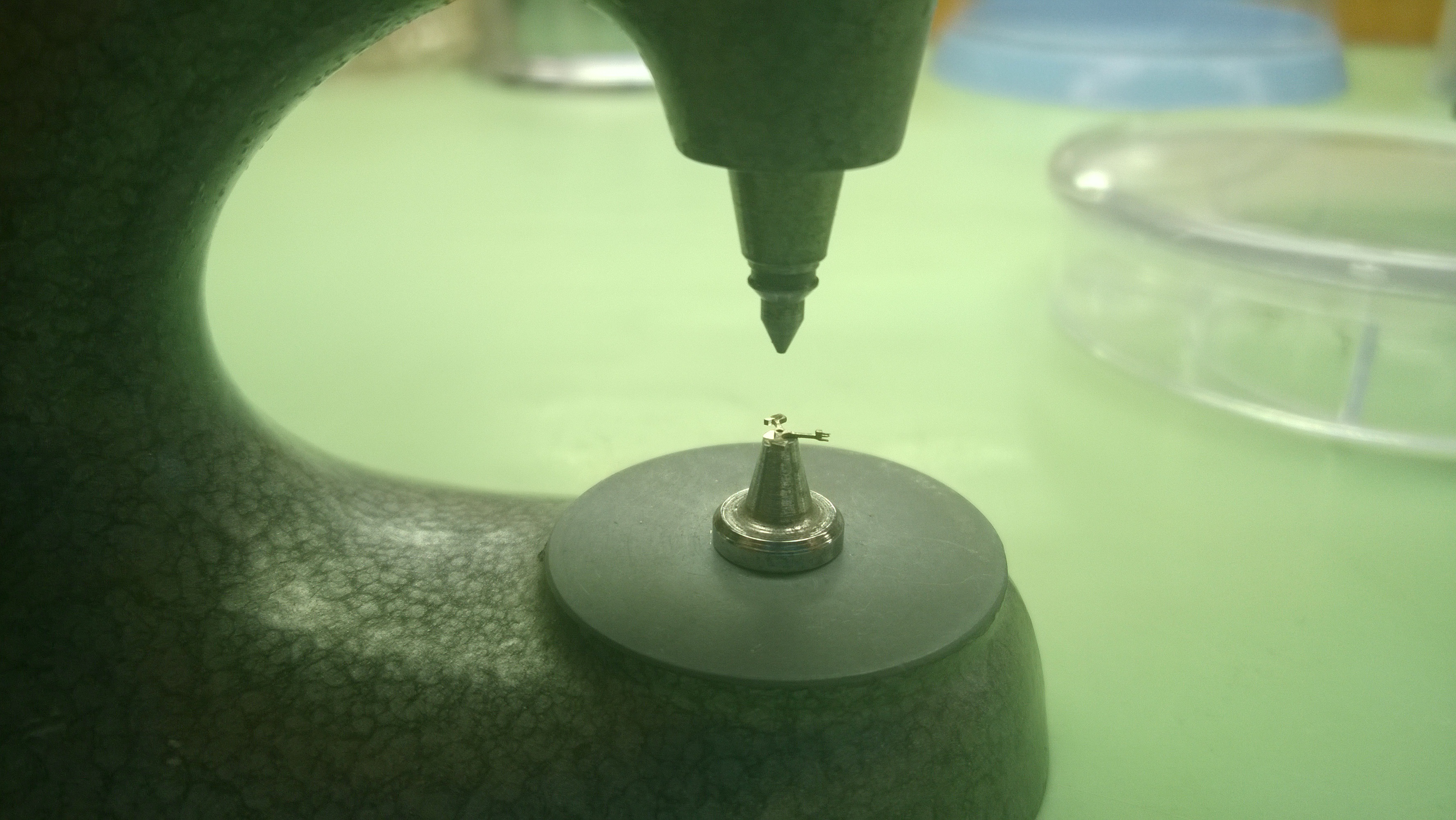 I finished up my pallet arbors on Thursday. The process for doing that is relatively straight forward, in that you just need to reverse the process. You place the now empty pallet fork on the stump of the jeweling tool.