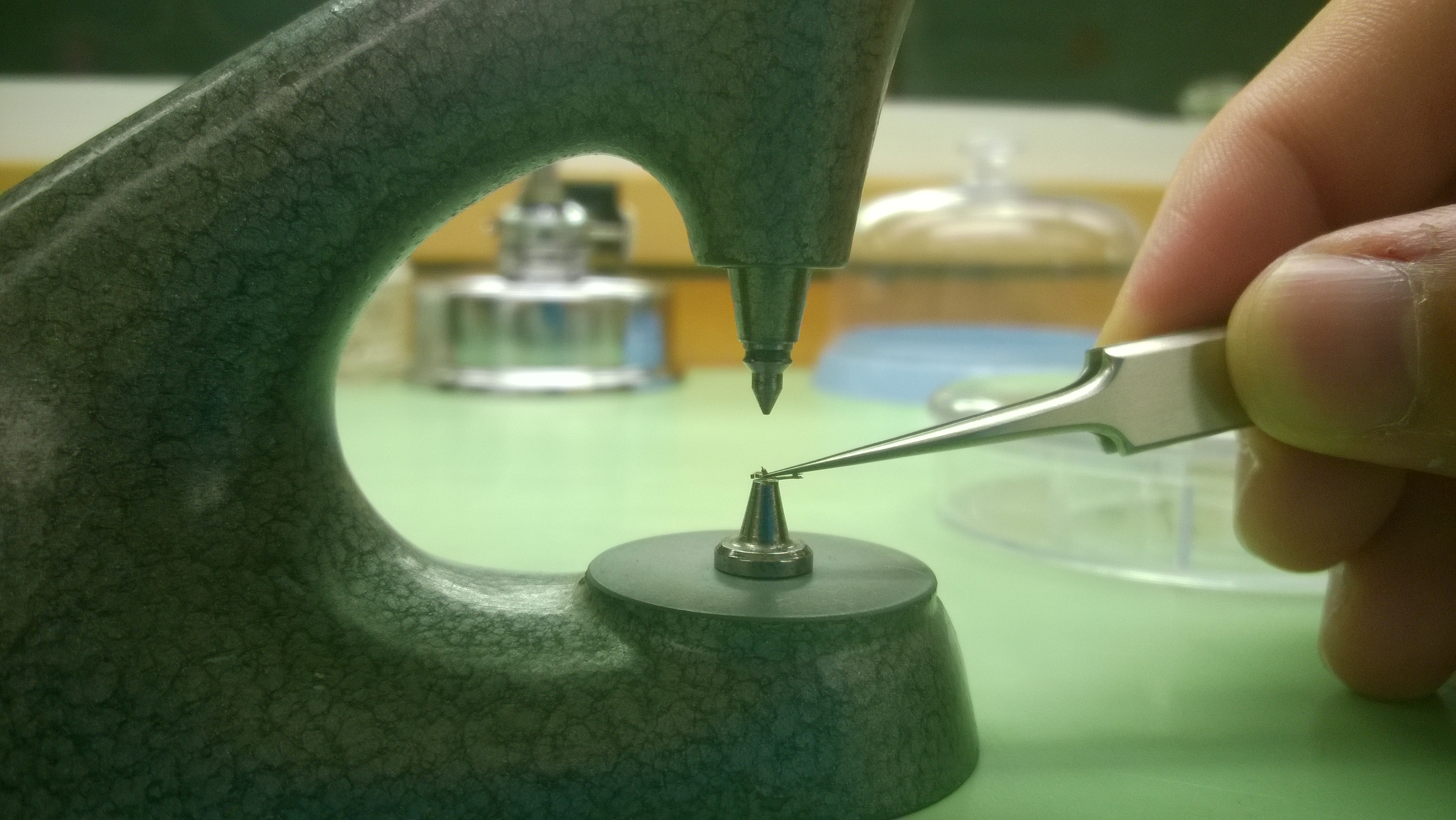Using a pair of tweezers, take the pallet arbor and place hold it over the empty hole and slowly lower the punch until it is just above the the arbor.