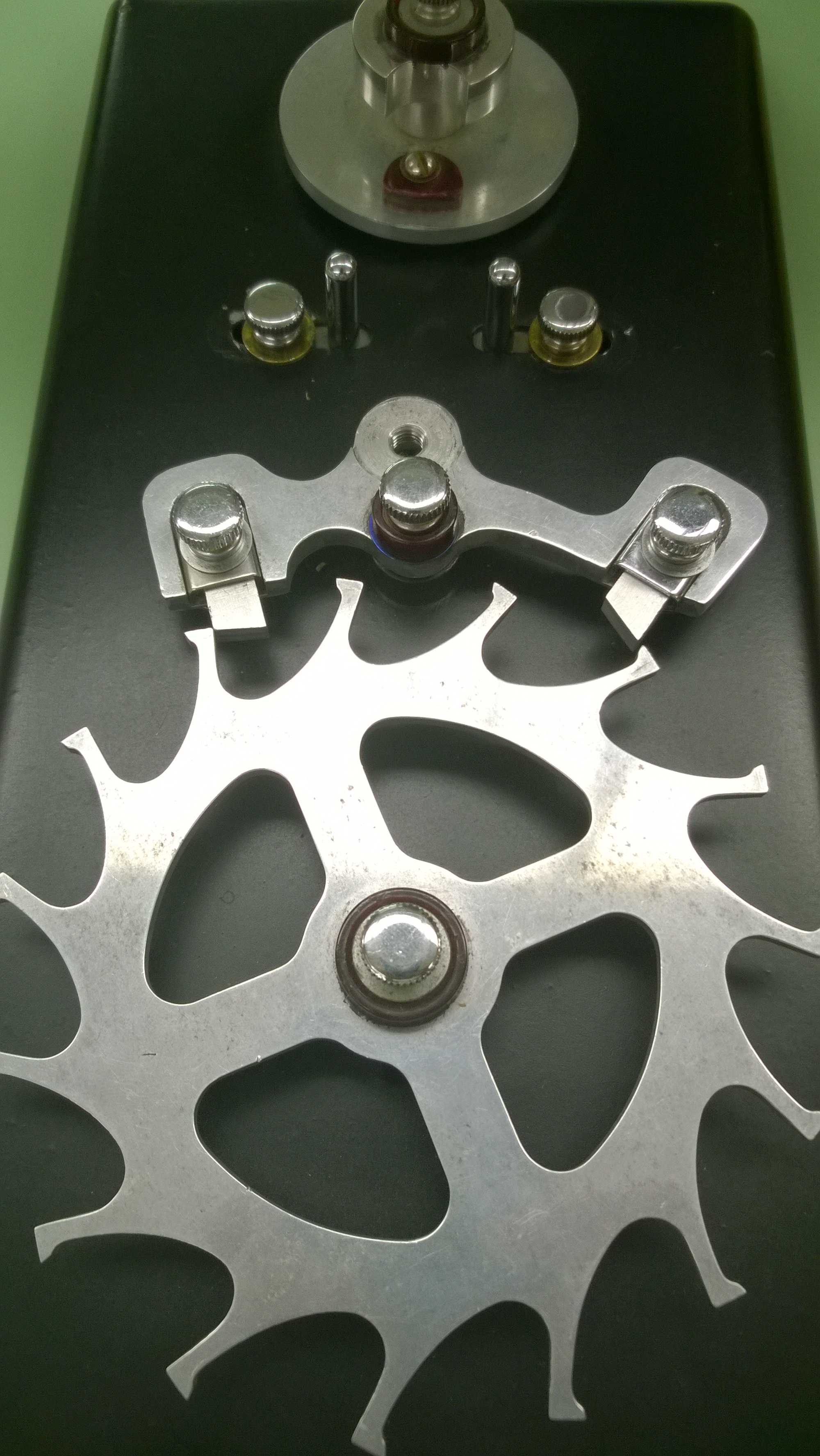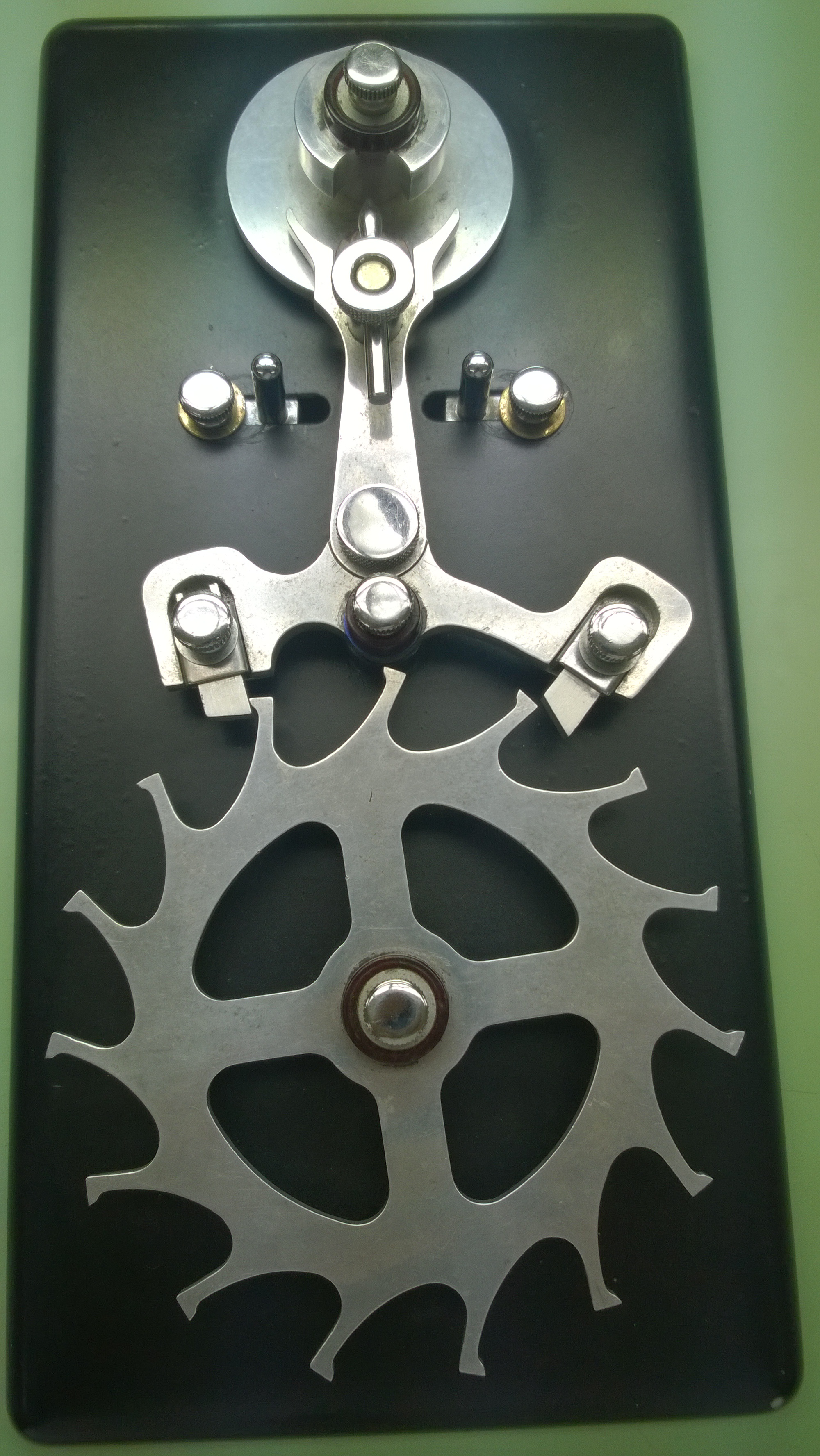 This, is the crib toy. It is a large model of the escapment (minus the balance wheel) The pallet stones, fork shank (middle part of the pallet fork), banking pins (the pins on the left and right of the fork shank), guard pin and roller jewel are all adjustable. You can work with the tool in a few different ways, but the way we do it in class is to start from the jewels and work our way up to the roller jewel.