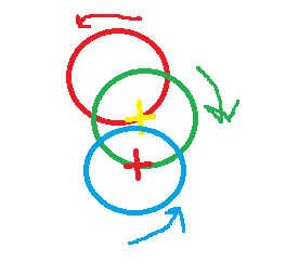 Okay, in the above picture, you have three gears. The colored arrows represent the direction that the corresponding gear is turning. The three crosses represent the pinions of the gears, and you are going to have to pretend that there are teeth on the edge of the gears, as well as some depth to the drawing. The red gear teeth are interacting with the pinion of the green gear (yellow cross) and causing it to rotate clockwise. The green gear teeth, in turn are interacting with the blue gear pinion causing it to turn counter-clockwise. Due to the nature of the force and the layout of the gears, the gears are trying to separate from each other (but aren’t able to do so due to the bridge and plate keeping them in place in a watch) in a down and lateral fashion. So in this drawing, the pressure from the red and green gear would cause the green gear to be pushed down and out to the right. The pressure from the green gear would cause the blue gear to be pushed down and to the left. It is because of that kind of pressure that you get an egg-shape that forms from the center of an oil sink hole.