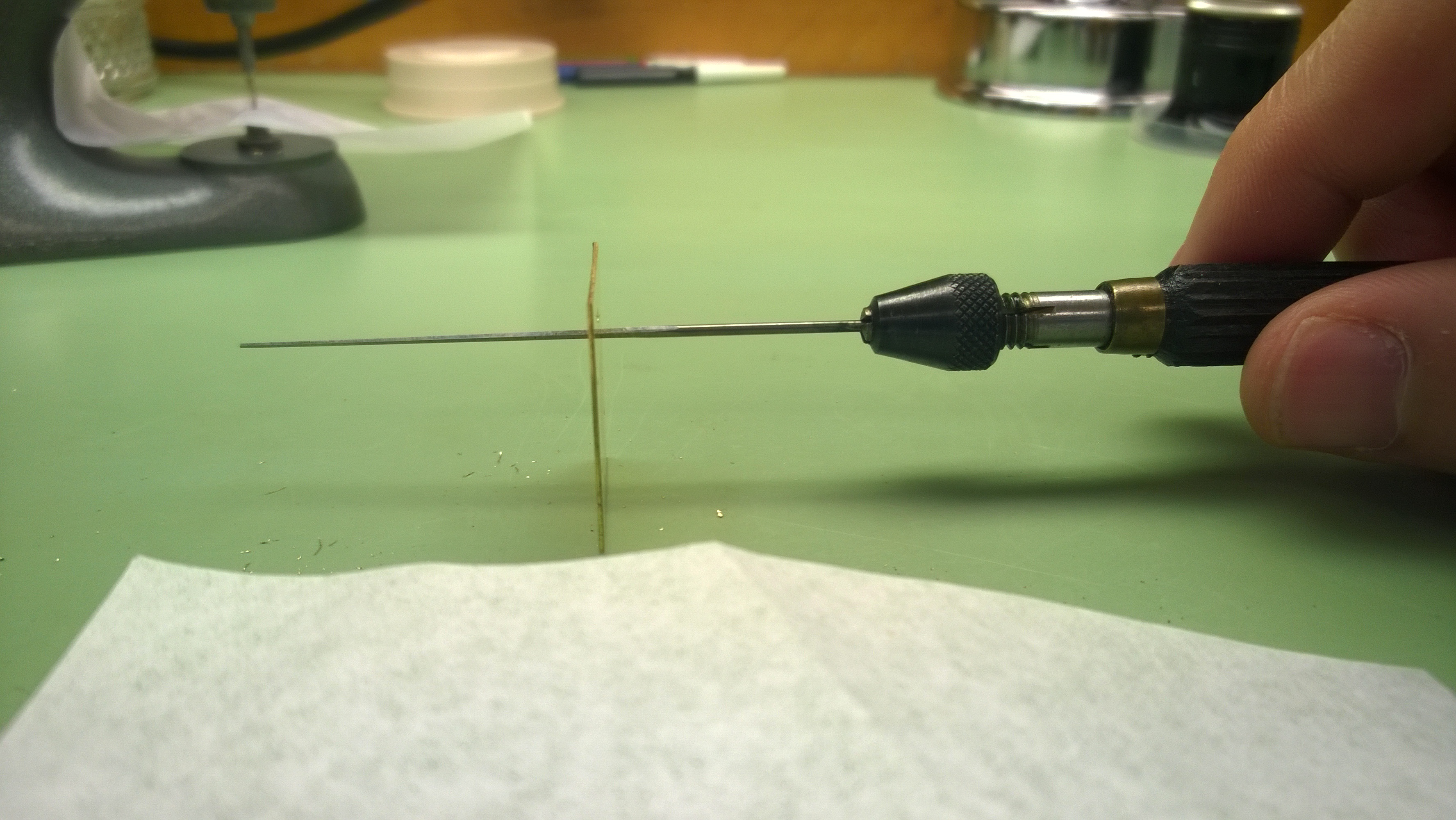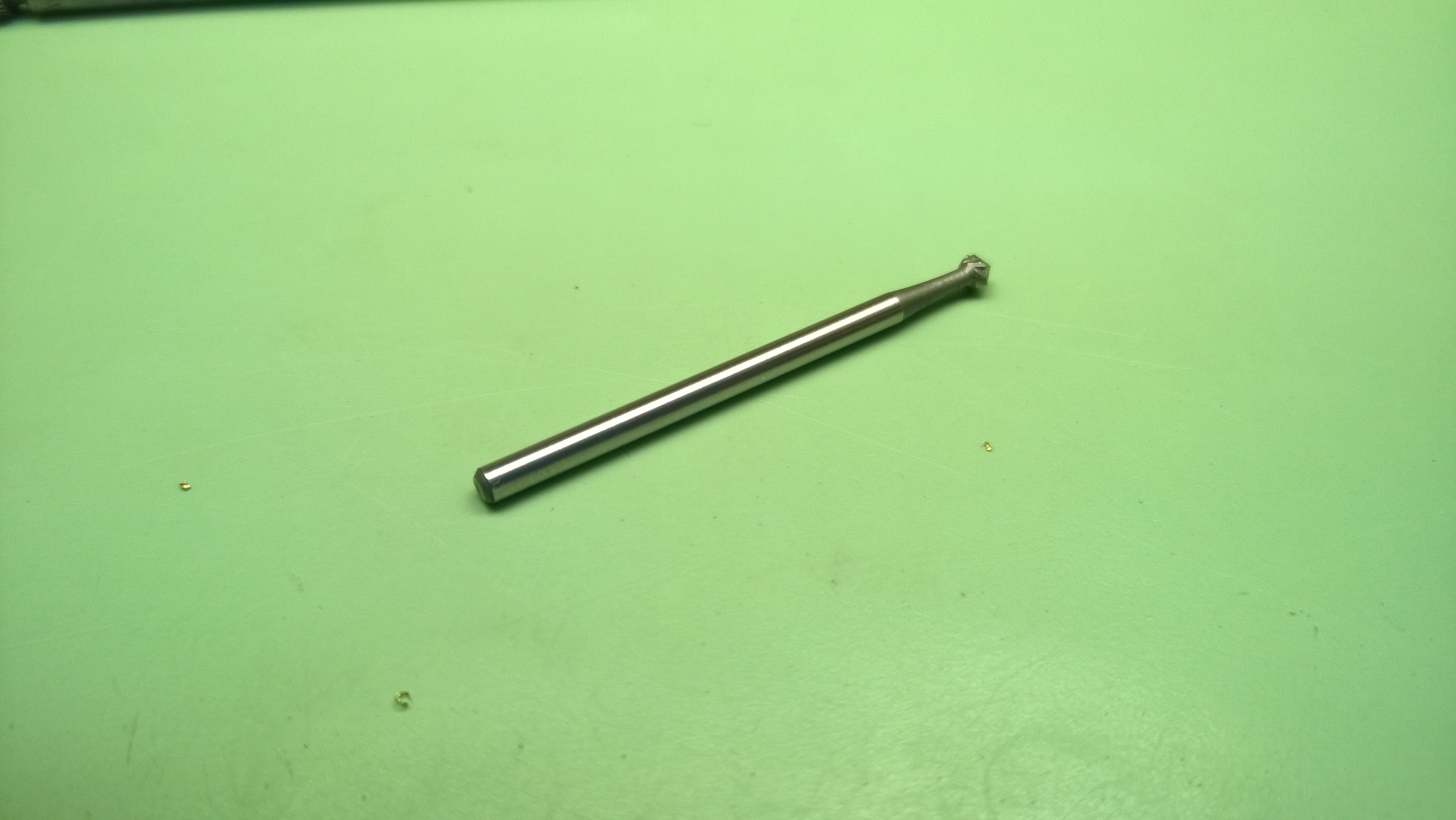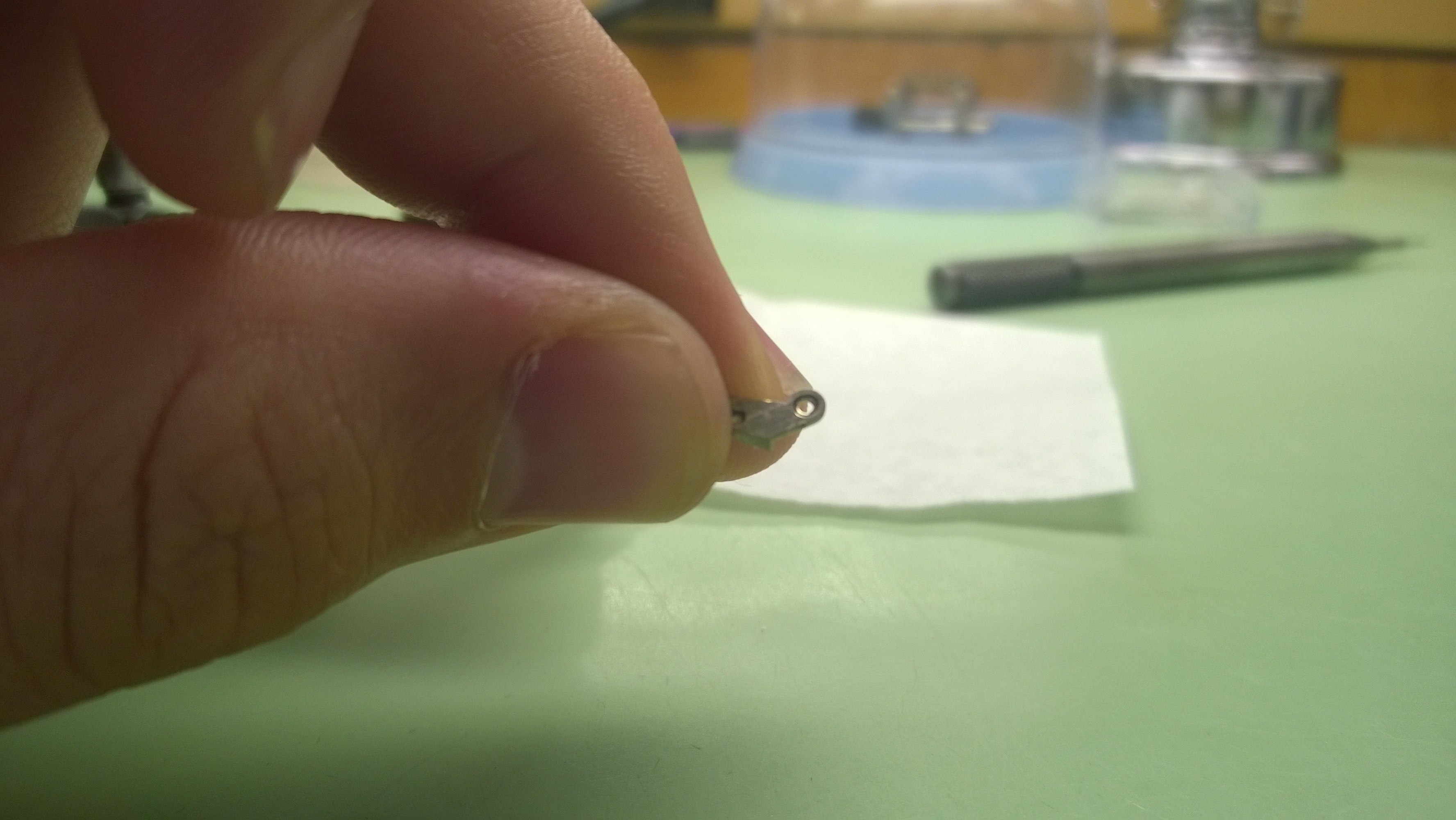 To use the tool, you simply press it on the hole and spin it around. It will remove the excess metal. At this point, I was left with a series of six, clean, 1 mm diameter holes that need to be made 1.29 mm so I can friction fit 1.30 mm jewels in them.