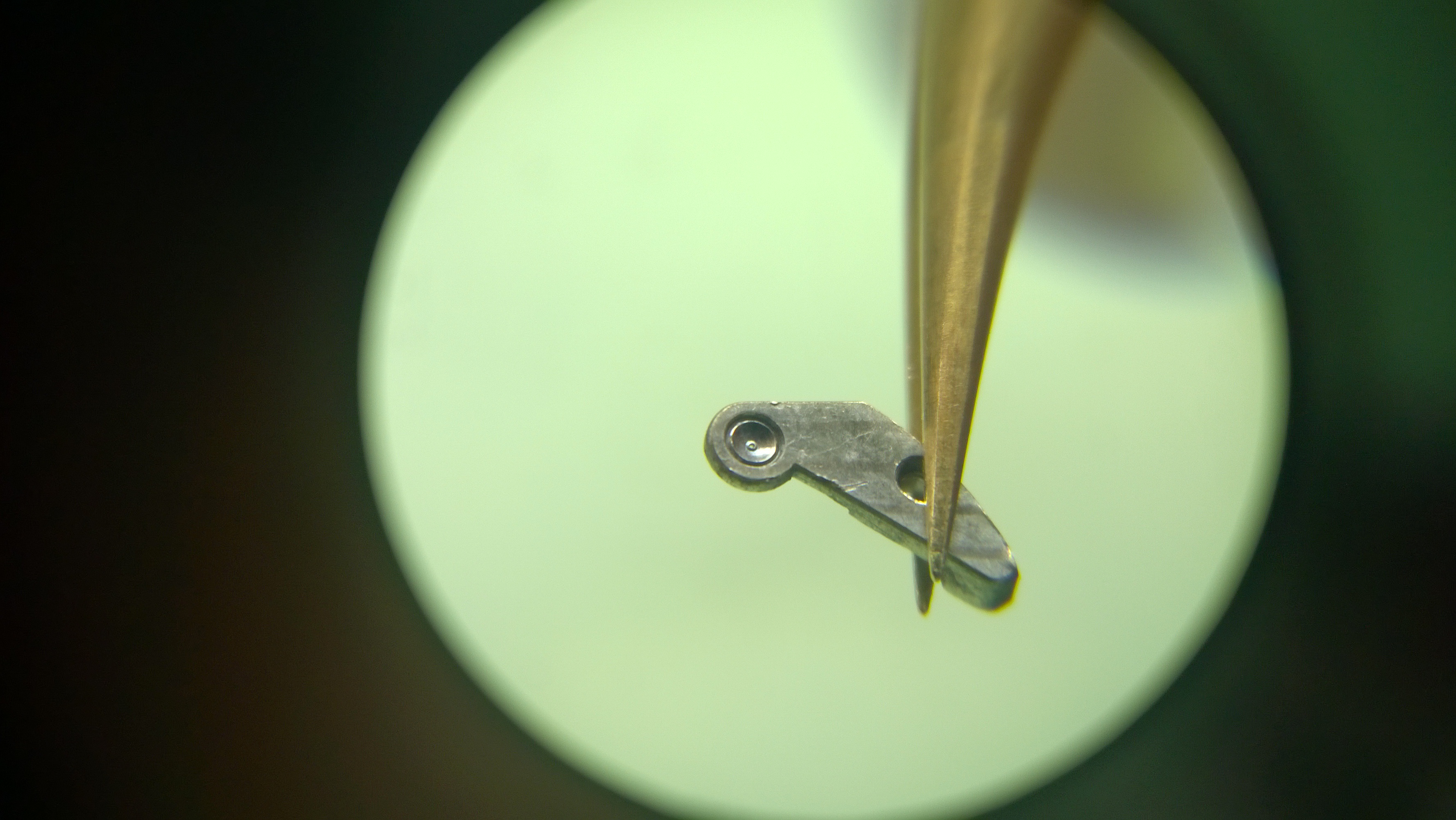 In the process of reaming the jewel with a .79 mm reamer The watch paper is there to protect the finish on the bridge.