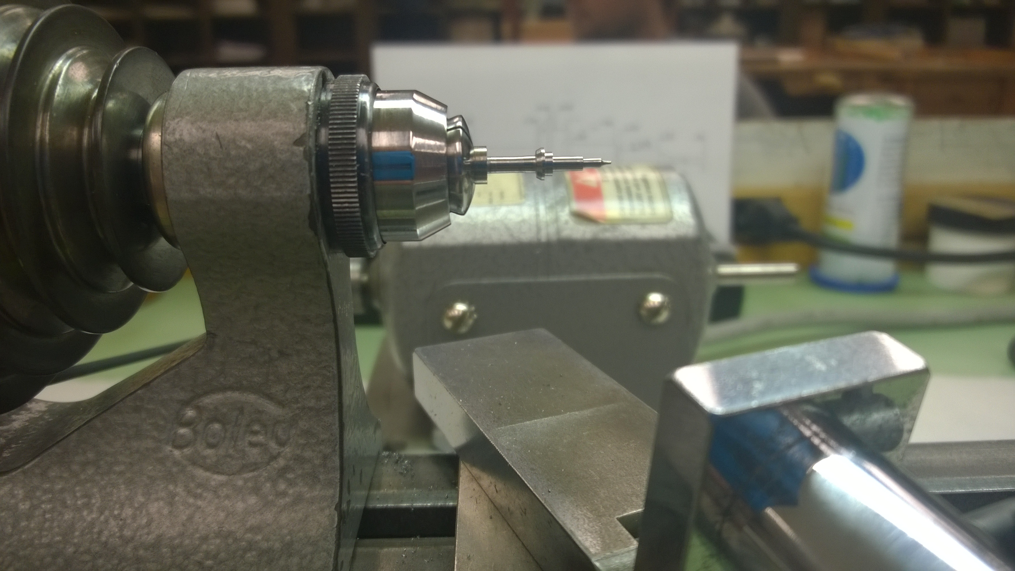 When I started my staff, I first figured out the overall length of the staff and added about 2 mm extra to the length and had that protruding from the collet. After that, I took the length from the balance hub to the upper pivot and started turning down my first diameter. The reason for this is simple-if I can set the maximum diameter first I could focus on working outside in (slowly working my way to the largest diameter), that way, if I made a mistake I could cut off the mistake and extend the balance hub measurement backwards and start again. If I messed up on the balance shoulder, I could extend the hub backwards, turn the balance shoulder into the collet shoulder and the collet shoulder into the oil groove/upper pivot.