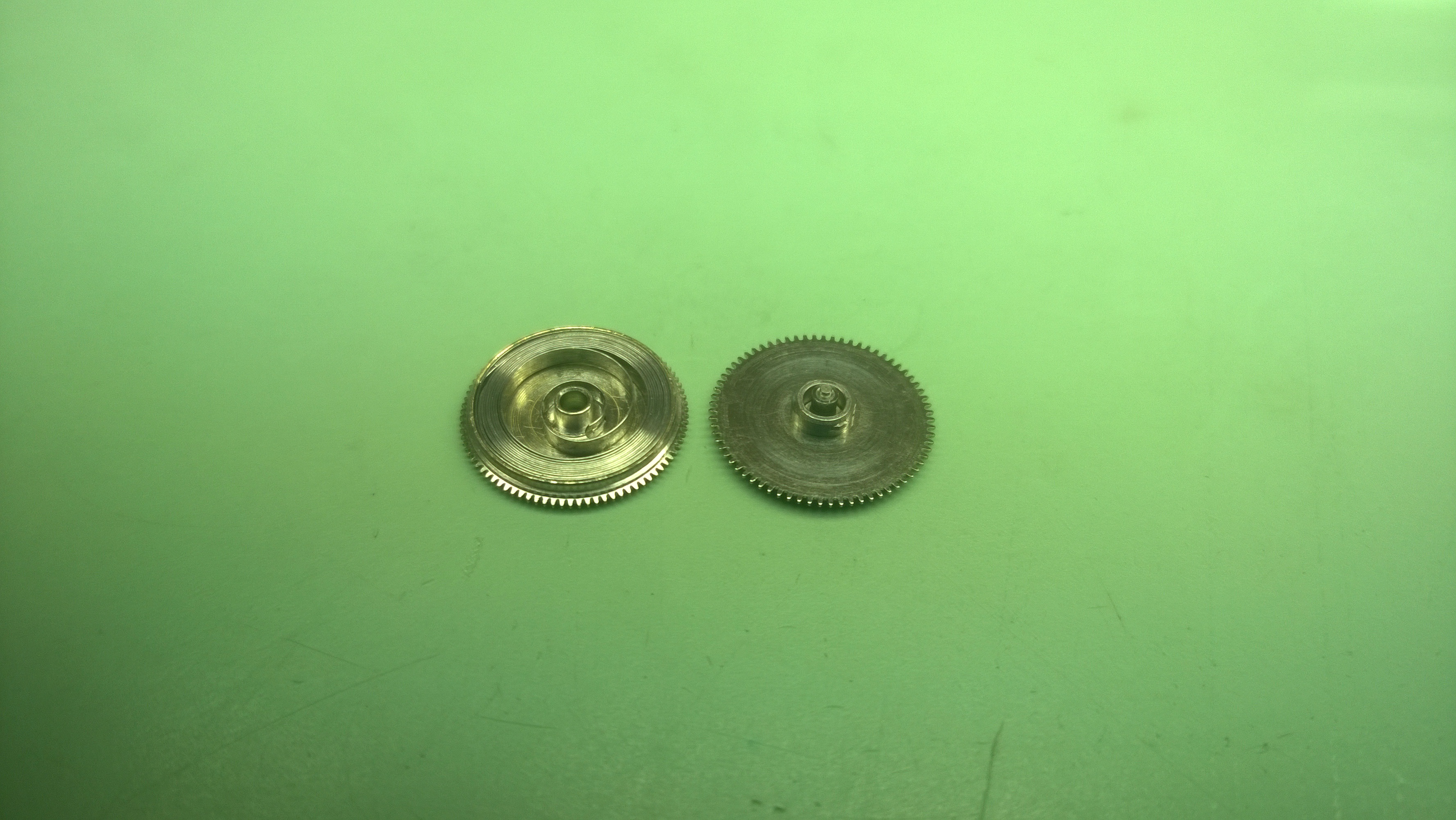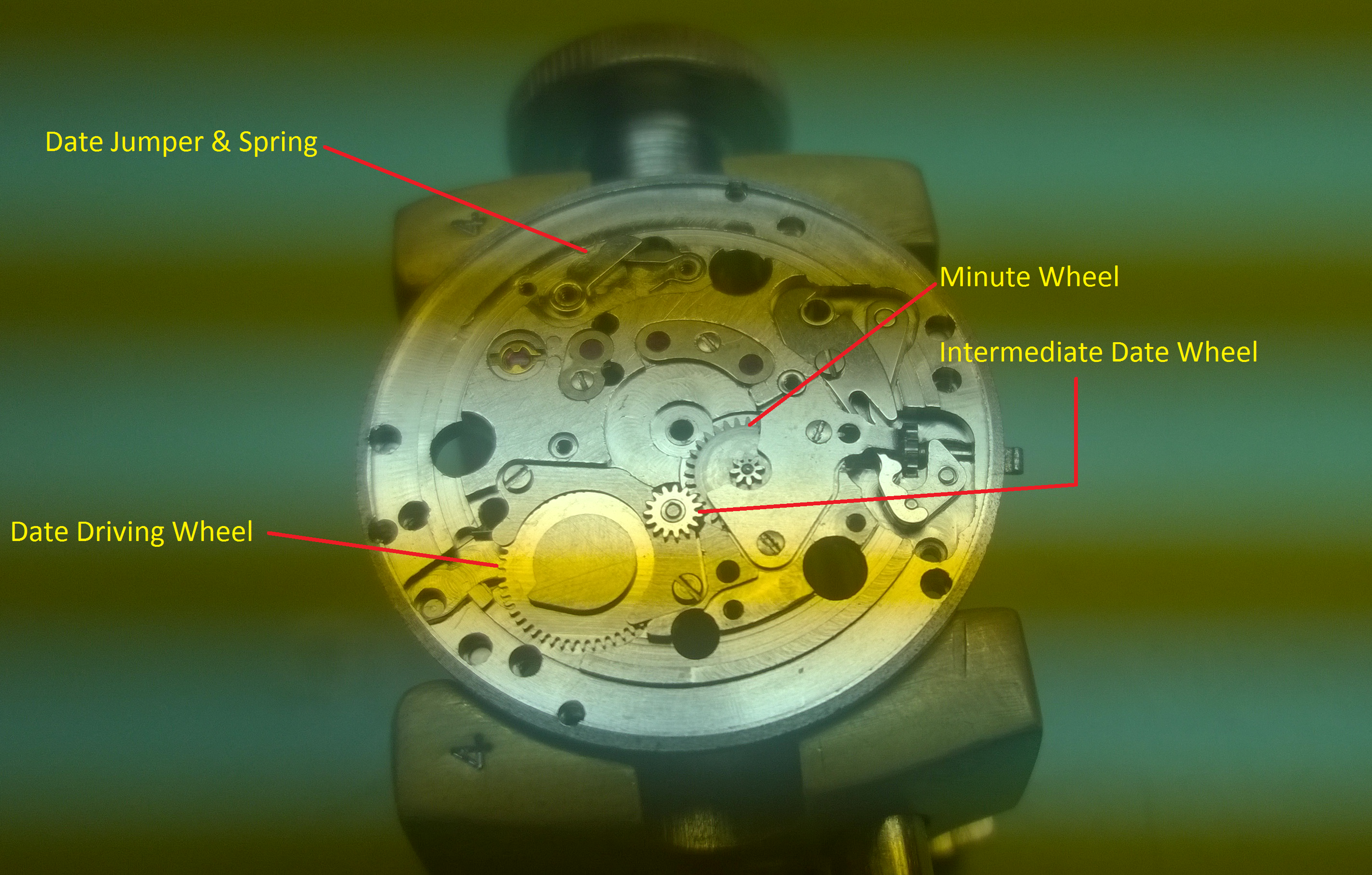 Starting on the right at 3:00, you have the keyless works (the winding and time-setting mechanism). Moving in towards the center, you have the minute wheel being held down by part of the keyless works. The minute wheel drives the hour wheel (not pictured) touches the intermediate date wheel. This wheel is actually two wheels riveted together. When the hour wheel turns the top wheel, the bottom wheel turns accordingly. The intermediate date wheel turns the date driving wheel. The date driving wheel consists of two parts. The toothed wheel that is turned, and the large tear-drop looking part that does the turning/pushing. As the wheel turns, the large tooth (for lack of a better word) turns/pushes the date indicating disc (removed). Moving upwards to about 12:00, there are two parts that are integral to the calendar function. These parts are the date jumper and the date jumper spring. The date jumper spring keeps tension on the date jumper. As the tooth of the date indicating disc is being pushed by the date driving wheel, it is under constant tension from the date jumper. The date jumper rests between two teeth of the date indicating disc and will be slowly pushed out of place between 10:00 pm and around 2:00 am-ish until the date driving wheel has made a full rotation, at which point the date jumper will be on the edge of next tooth and will fall into place. As it ‘falls’ it will push/jump/snap/drive the date indicating disc into the next dates position (so going from the 12th to the 13th).