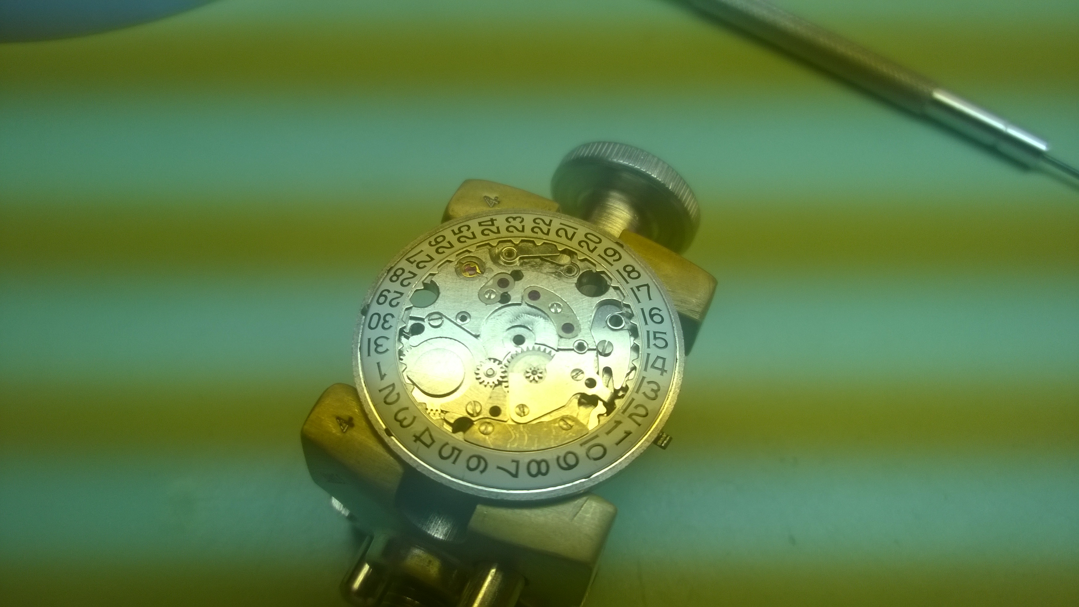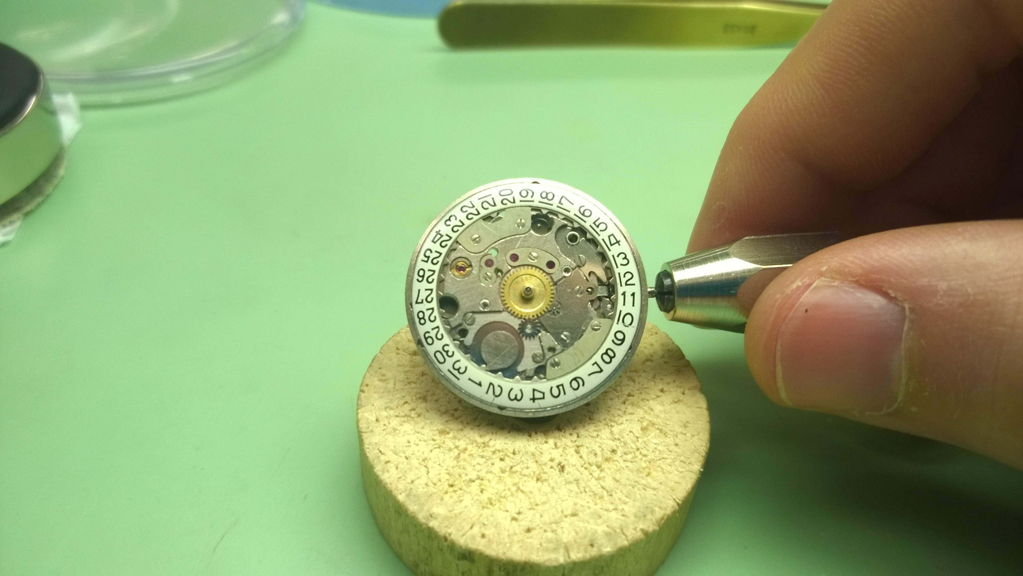After everything has been cleaned and reassembled, before you put the hands back on, you need to turn the crown until the date jumps from one day to the next. Doing so will ensure that you put hands on at 12:00. If you don’t do this and assume you put them on at 12:00, your date will not change at the correct time.