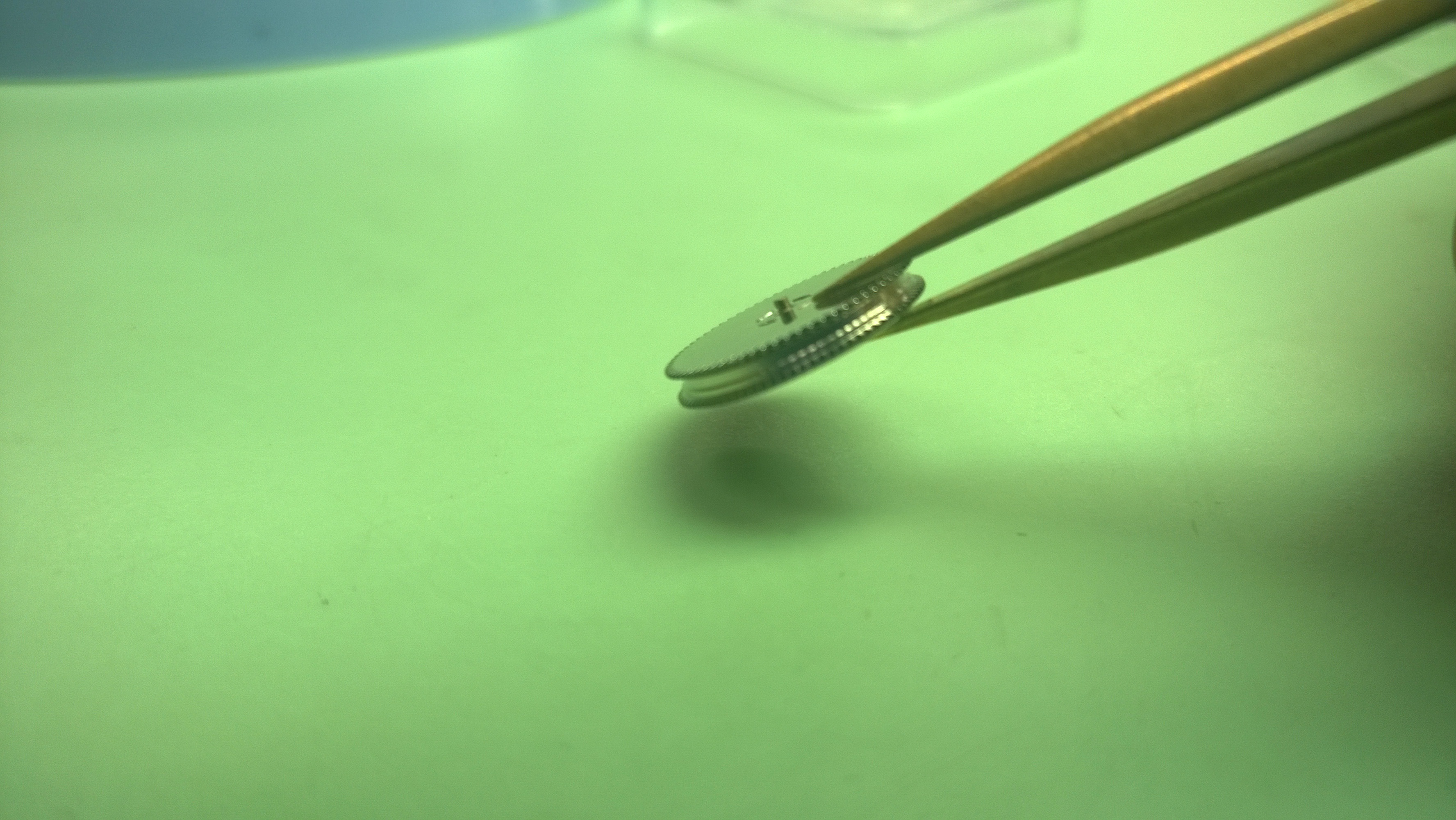 In the above picture, you can see the auto gear train. The small wheel that is immediately to the left of the rotor post is called a wig-wag wheel. The post the wig-wag is on is slightly oblong in its shape. This gives the wig-wag an elliptical movement pattern, so it can engage the rotor and one of the other wheels at the same time. Jumping up to the topmost wheel, you have a winding-up wheel, a reduction gear and a driving-gear for the coupling wheel. To see the coupling wheel, look at the driving-gear wheels arm that is pointing to 9:00. The “hole” that you see is actually the coupling wheel. The coupling wheel serves as the link between automatic rotor and the ratchet wheel.