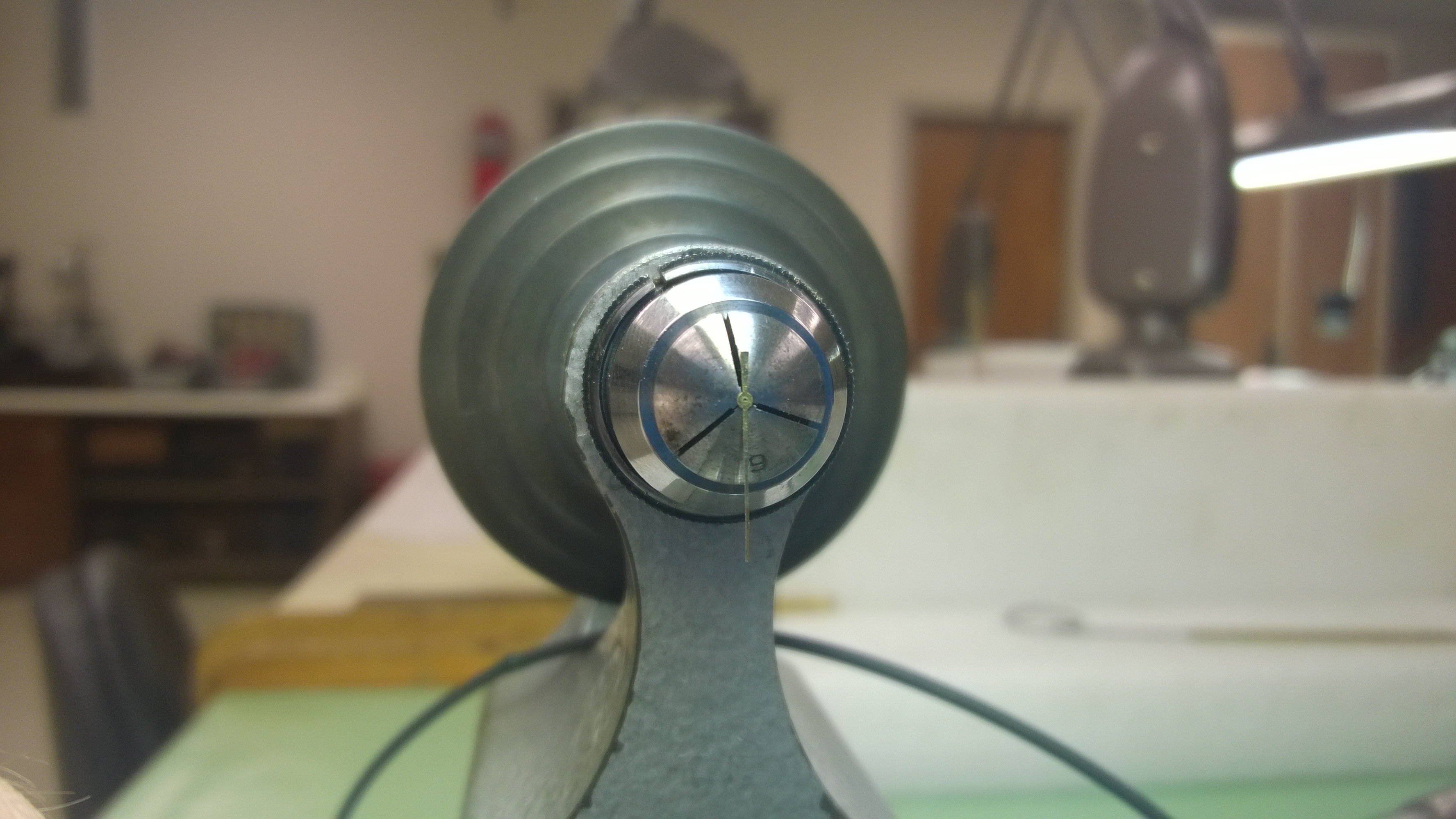 The last thing I did with this watch was actually related to the hands. The Seconds hand was loose. When I went to press it into place, it slipped on and off its post with no tension whatsoever. When I would rotate the hour/minute hands to check for clearance, the seconds hand would fall off. When the watch was in a vertical position or dial down position, the seconds hand would fall off. The ideal solution in this case would be to install new hands. Were I not able to find new hands, there are ways to repair the post for watch hands if needed. Without doing a crazy repair, my teacher suggested that I try tightening the post using a lathe chuck. A lathe chuck will put pressure on the hand post from three directions giving a more even crimp.